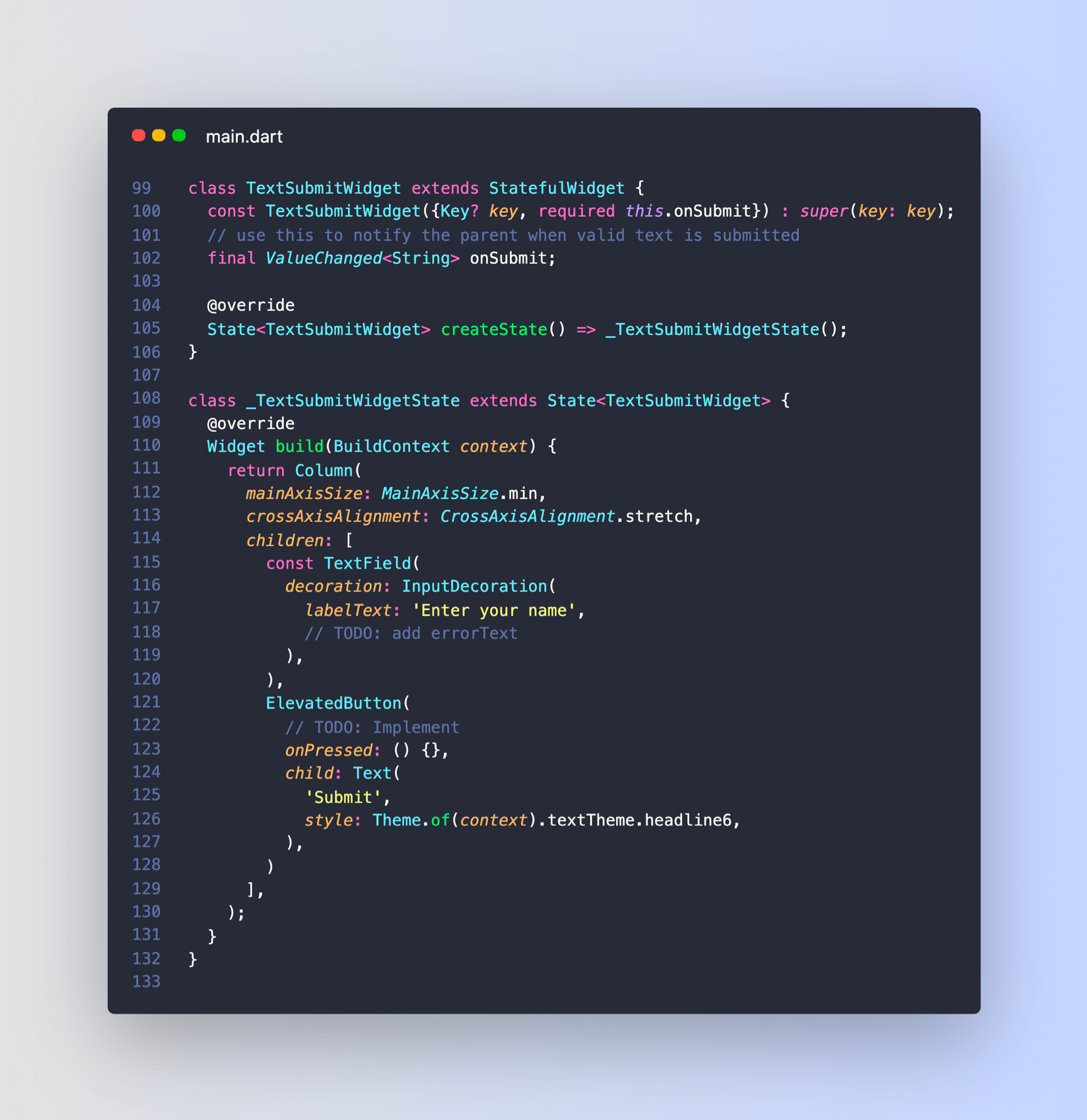 Let’s start with a StatefulWidget that contains a TextField and an ElevatedButton.
