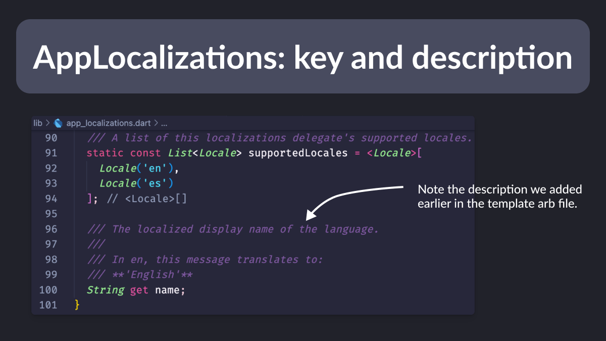 Inside the main file (app_localizations.dart), we can notice the key name from the ARB template, along with the description.